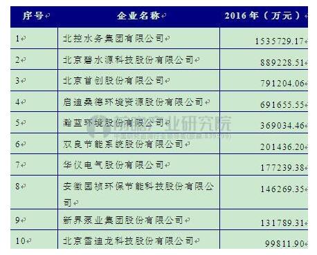 圖表2:2016年中國污水處理市場銷售收入企業(yè)排名(單位:萬元)